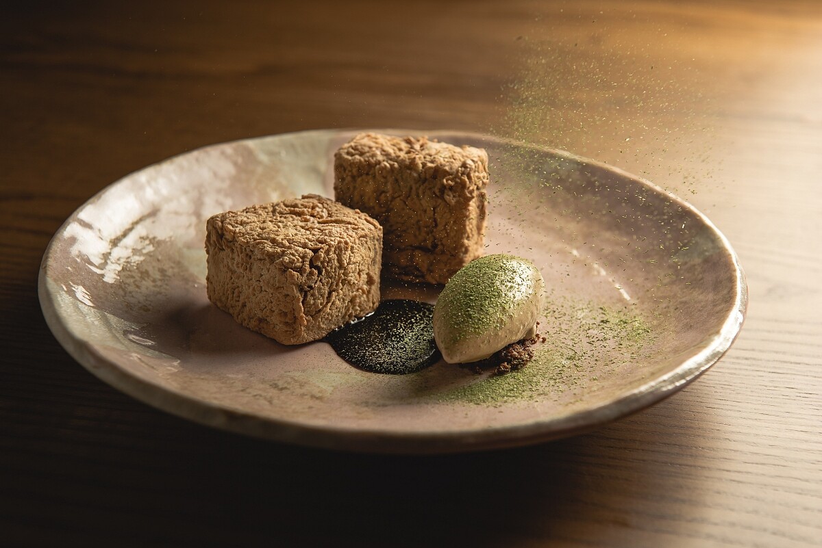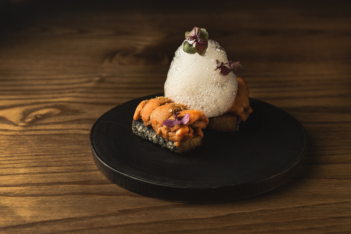 融合柚子汁與柴魚昆布高湯高速將空氣打入成細密柚子泡沫,輕盈蓬鬆如白色雲朵,入口清新柚香將綿密海膽與香脆海苔醋飯迸發的濃郁海味完美包覆,上層點綴的紫蘇帶來一抹婉約清香,讓日式海膽握壽司呈現更豐富口感與多重滋味。