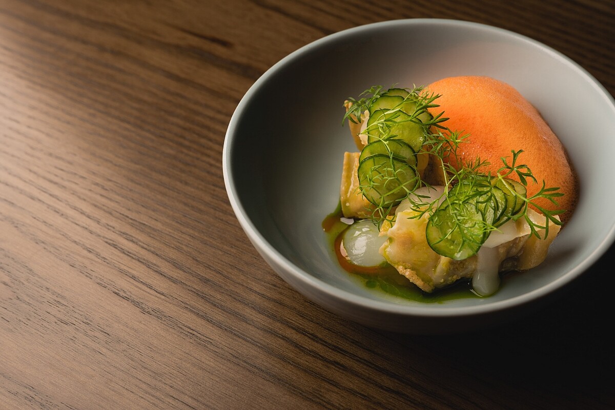 以台灣涼麵概念呈現鴨肝餃,餛飩⽪包覆油封鴨腿肉絲及⾹煎鴨肝,拌⼊酸香芝⿇醬,佐荔枝果膠,清新果⾹平衡肝餃濃郁⾵味,傳統涼麵搭配的⼩⿈瓜絲、紅蘿蔔絲則以醃⼩⿈⽠、胡蘿蔔泡泡呈現。⼊⼝熟悉的台灣涼麵芝麻醬⾹中,堆疊南洋香料氣韻,⼜可品享法式煎鴨肝與油封鴨的濃郁細膩滋味。