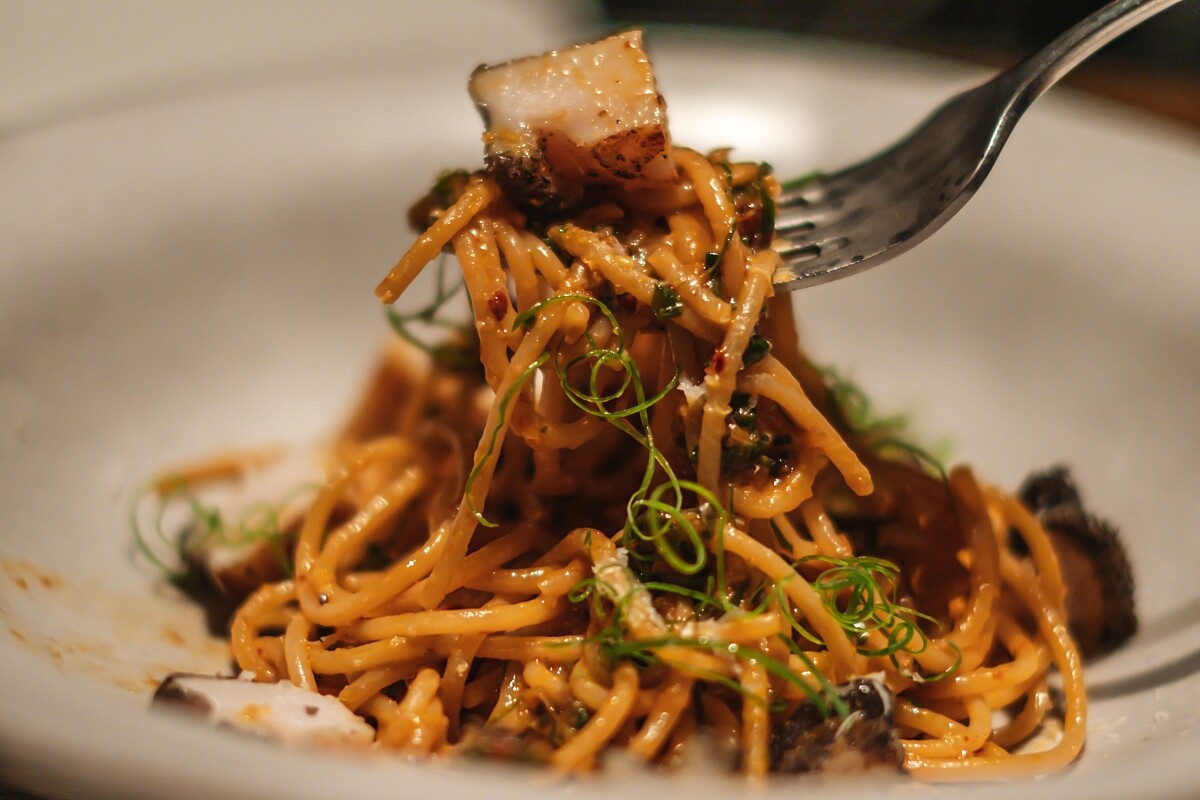 結合義大利麵與中式乾拌麵,自製麻辣油加入老乾媽辣椒、新竹福源花生醬、紅蔥頭、蠔油、蔥蒜等,為辣味增添堅果溫和香醇及厚度,拌入彈牙義大利麵及煨煮柔軟Q香的甘鮮鮑魚,最後刨入帕馬森起司,噴香夠味,誘人胃口大開。