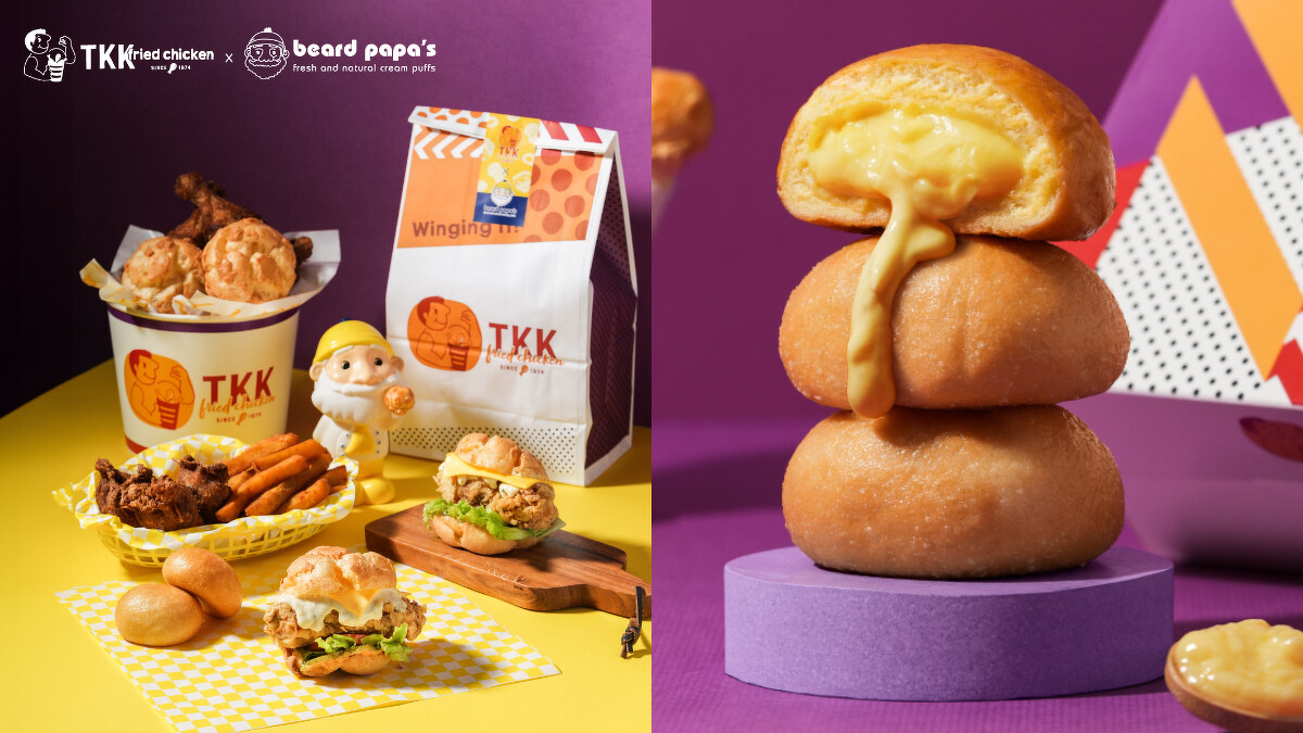 beard papa’s和頂呱呱攜手推出「卡士達甜甜包」,金黃色的甜甜包搭配beard papa’s卡士達內餡的最強組合,奶香滑順不甜膩。另外還有「田園卡士達炸雞泡芙堡」,在beard papa’s招牌日式泡芙皮中夾入頂呱呱超厚實炸雞、特調田園卡士達醬與新鮮時蔬,漢堡控和甜點控都不能錯過!