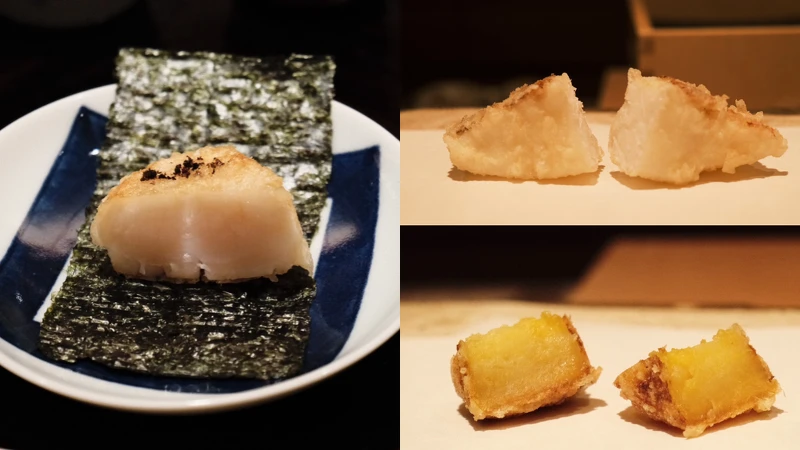 以明星餐點海老天婦羅為例,就分為三種型態,蝦頭以「炸蝦仙貝」薄衣酥炸,乾爽香酥不帶絲毫油氣,一口咬下如現烤仙貝,越嚼越香;而蝦身的部分,則分為「薄炸海老」及「酥炸海老」多段多重體驗。「薄炸海老」麵衣薄如蟬翼,一口咬下去極為甘香酥脆,半生熟鮮甜柔滑的肉質,鮮甜彈潤,嘴裡還留有尾韻綿延的餘香。「酥炸海老」使用不帶筋性的麵衣,就能緊緊包覆鮮蝦肉身,外殼咀嚼酥脆,與紮實新鮮肉質形成強烈對比。