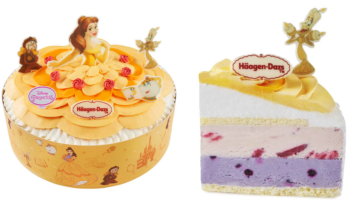 「貝兒真愛」以草莓冰淇淋搭配藍莓冰淇淋,2種口味交織出酸甜好滋味,7英吋售價$2,380、10英吋則是$2,880。 蛋糕上貝兒公主身穿一襲鵝黃色禮服,被茶壺太太、盧米亞等經典角色環繞,裙襬以巧克力甘納許打造而成,宛如在蛋糕上翩翩起舞。