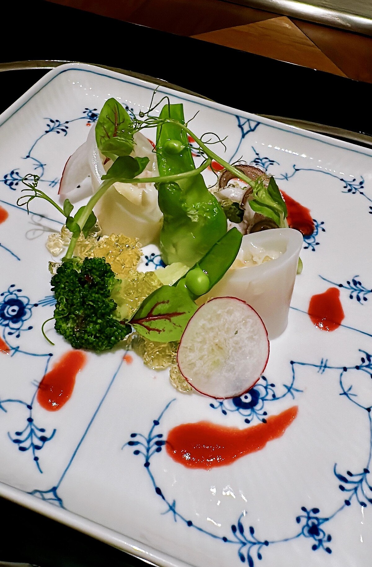 以酸甜的新鮮覆盆子醬汁與番茄晶凍突顯襯托山菜本身的鮮甜,入口清爽開胃,立體擺盤有春天植物由地而出,欣欣向榮的意象。