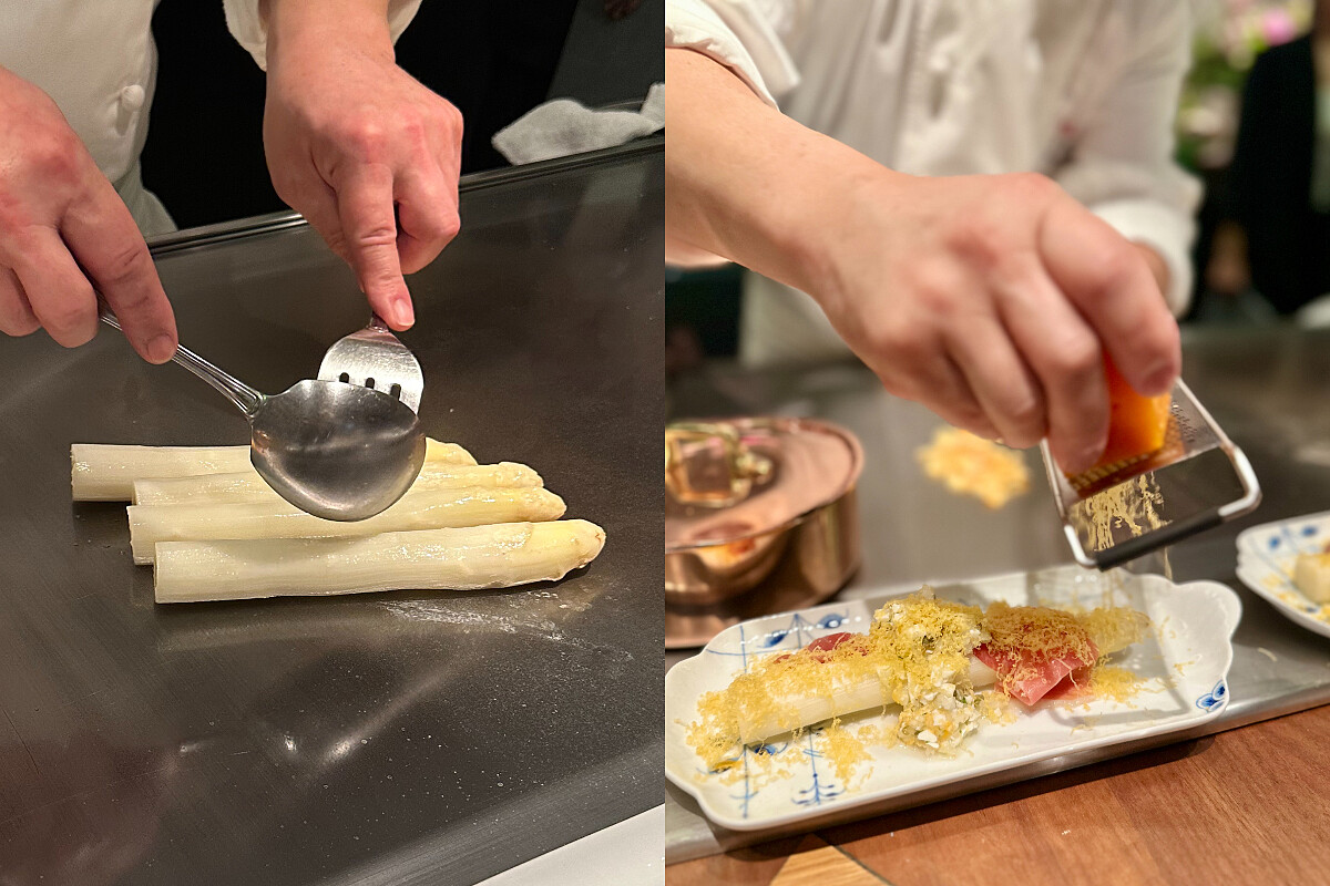 特別選用3月才有的法國白蘆筍,象牙白色的白蘆筍纖維特別的細緻,口感清爽鮮甜。