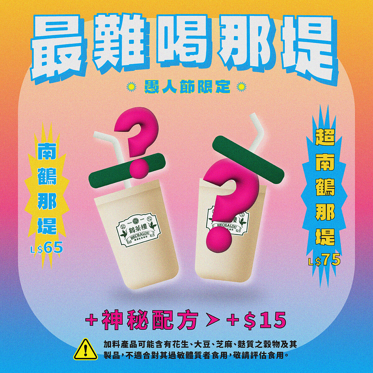 鶴茶樓以「南鶴那堤」、「超南鶴那堤」迎接愚人節的到來,讓門市店員隨機幫你選茶底再加入鮮奶,還可以加價升級加料,但依舊是不讓你自己決定要加哪一種,真的宛如是在開盲盒!