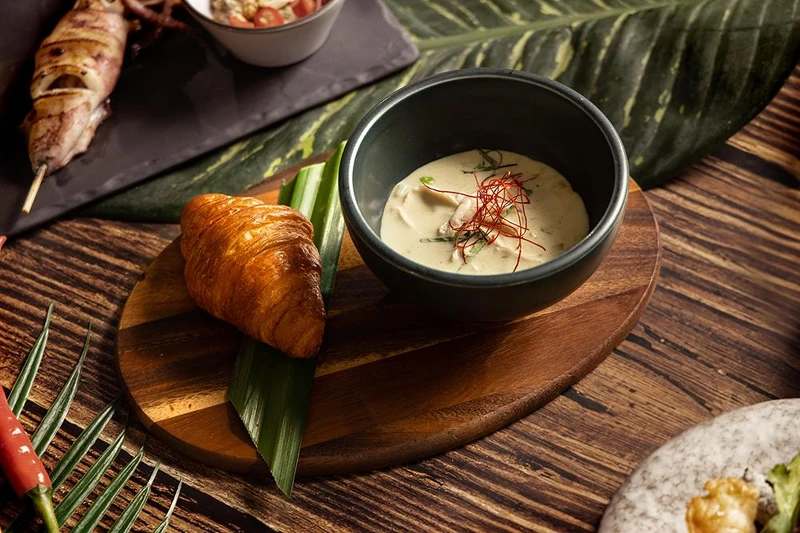 以低溫處理的軟嫩雞胸肉加入雞高湯調製的濃郁綠咖哩,椰奶柔和了辣味更添一絲甜感,搭配同樣奶香濃郁的酥脆法式可頌麵包,在微辣香氣中,暖了胃更打開味蕾。
