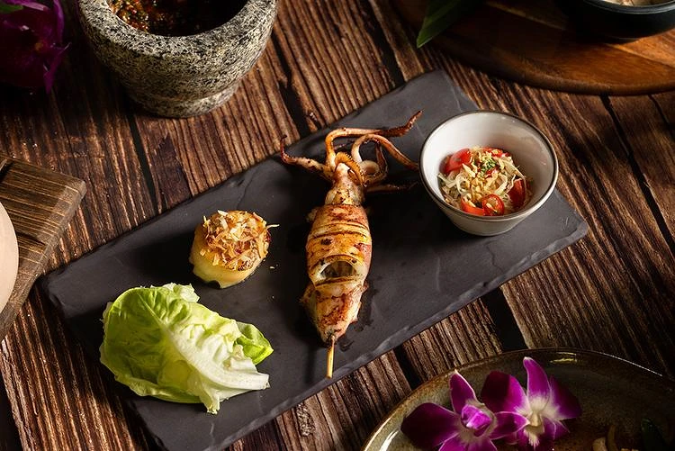 以蒜頭、南薑、魚露、辣椒、檸檬汁、香菜、紅蔥頭、椰糖、花生全放入泰式傳統「擂缽」搗碎,透過擊碎,食材香氣釋出,就成了最清爽解膩的泰式調味辣醬。每位賓客皆附一疊祕製辣醬,任何菜品都可自由搭配,創造專屬自己的泰式風味。