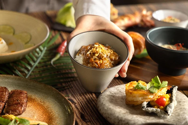 概念以「泰式風味清湯」加入特殊香草而獨具個性。主廚在再加入牛腱、牛筋燉煮湯底,使用大量香料以萃取精華,直至熬出甜美清澈湯底後,方能成為清燉甘甜、入喉生津的牛肉湯。