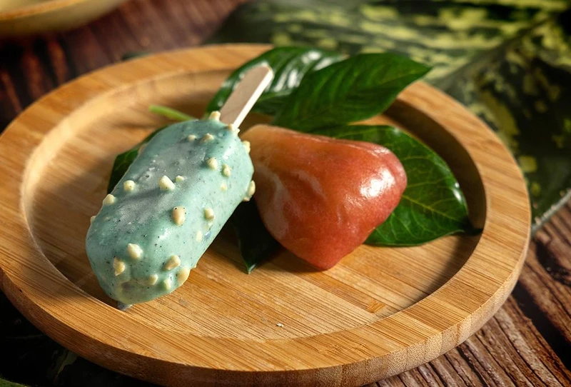 採時令新鮮水果搭配特選 Old Bridge 義式冰淇淋組合,主廚以香草冰淇淋為基底加入泰國常見的蝶豆花染色,並作成冰棒的外型,成功串連起以泰式風味為題的整套餐點。