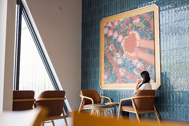 另外以中島型半開放式吧檯為門市焦點中心,落地窗處以軟性沙發搭配客製長型桌為規劃,另有共同會議桌、咖啡座椅及會議室空間,規劃配置多樣性的傢俱型態。門市藝術牆面設計以深層海洋藍為主要的色彩計劃,搭配淺色調木皮色調與清新自然的咖啡田園風景,塑造出舒適悠閒的空間氛圍。