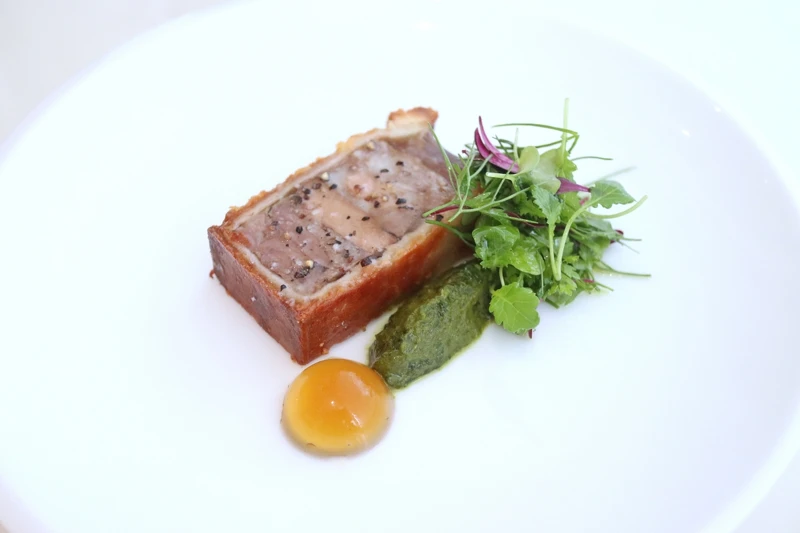 主廚的拿手料理,遵循傳統的工法製作而成,這次抽掉了冬天煙燻氣味,選用雞肉並放進各式內臟,像是雞胗、雞心、雞肝等等,再加入黑毛豬做成內餡,展現了肉派純粹豐腴滋味,一旁則有雪裏紅製作的抹醬,以及高湯凍作為搭配,並有平衡味覺的作用。