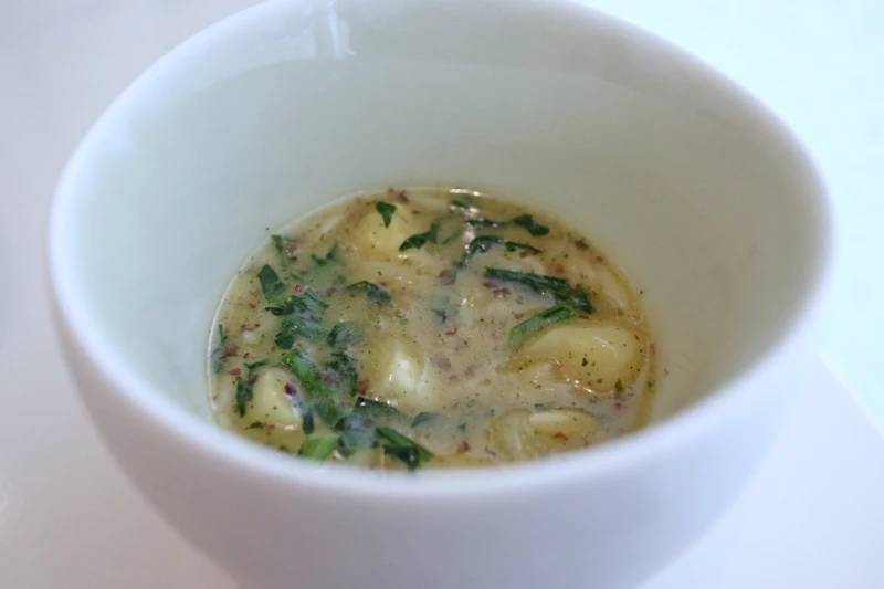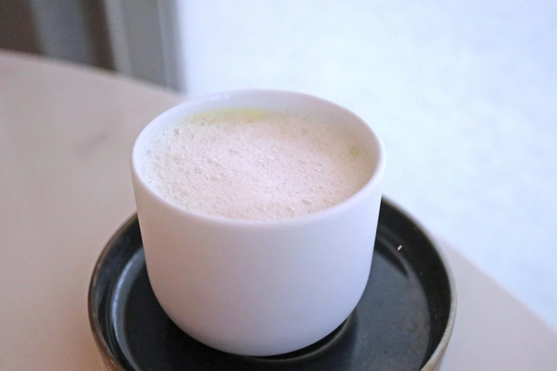 以玉米湯為基底,加入炙烤過的玉米粒,上方則有焦化奶油製作的泡泡以及焙茶奶油,溫暖甜美的香氣撲鼻而來,是一道香甜暖心的湯品。
