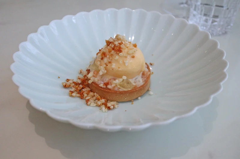 以春天盛產的枇杷作為主食材,主廚以杏桃、優格、琵琶做成冰淇淋,脆口的塔皮上方則有西方傳統甜點米布丁,琵琶果肉、白蘭地製作的果凍散落其中,最後灑上米製的爆米花、蜂巢糖脆餅,清新的果香加上豐富的口感為春季菜單做了美好的句點。