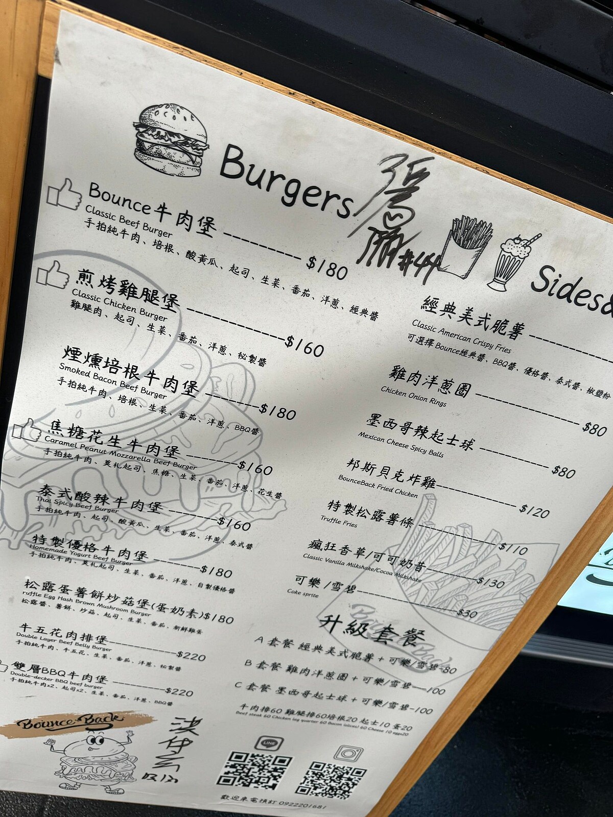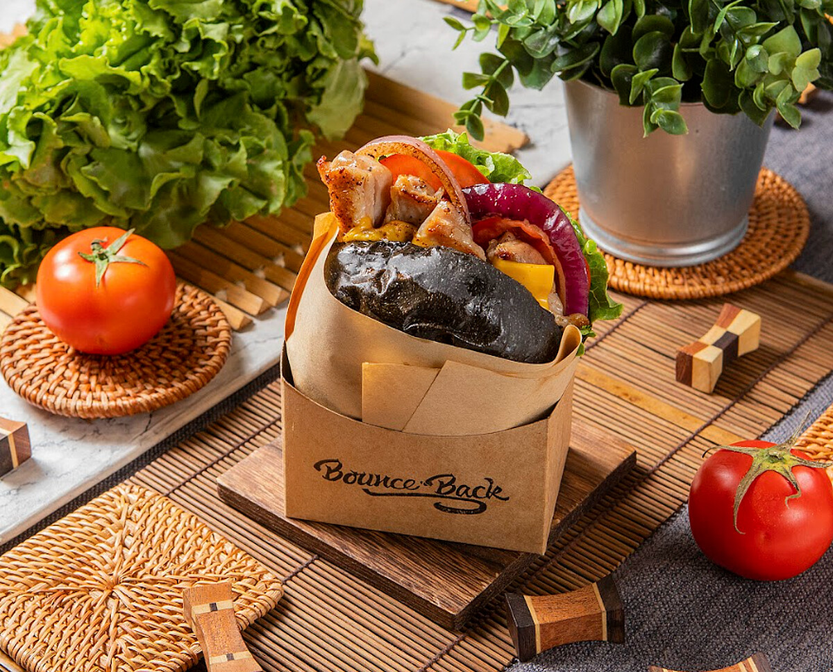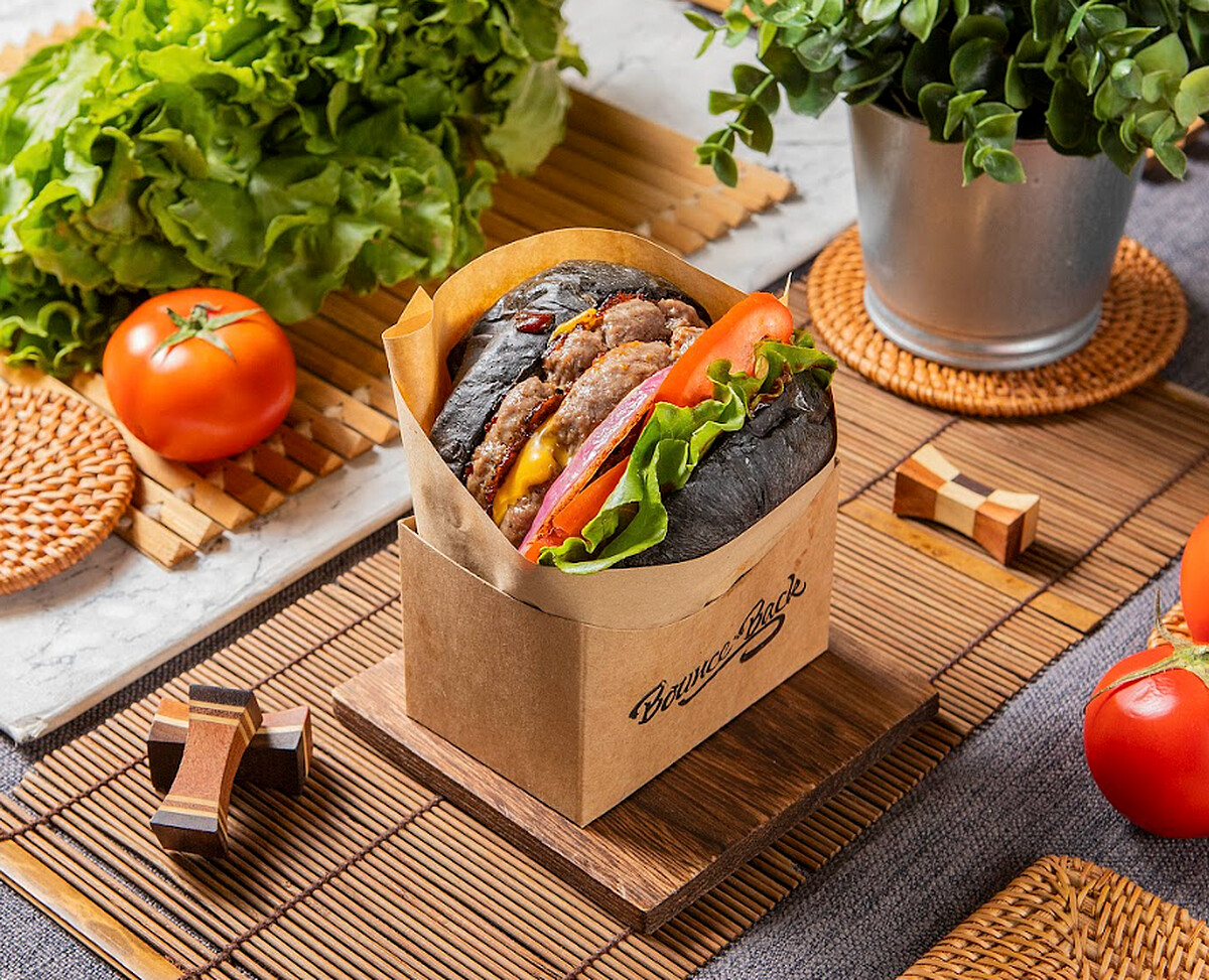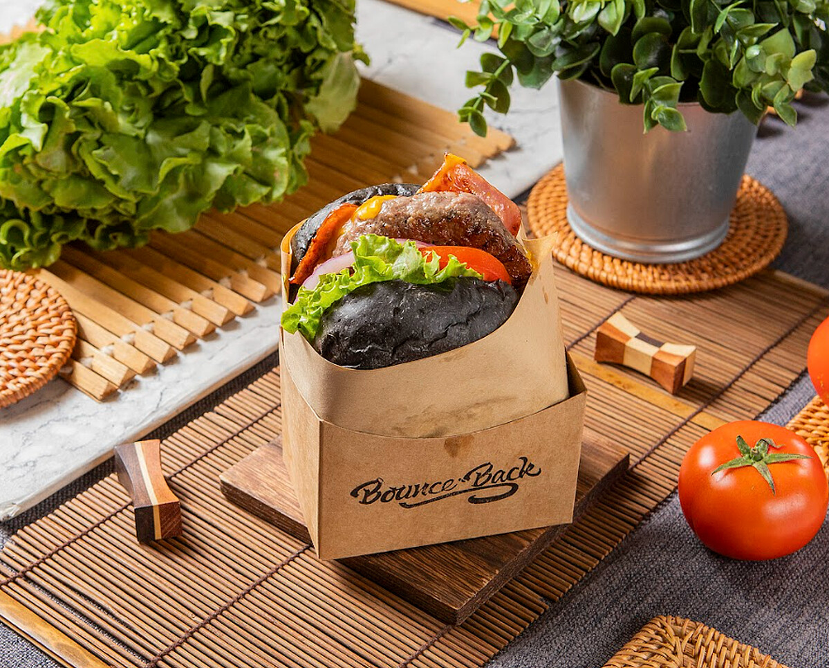 「BounceBackBurger」的招牌菜是以品牌命名的「Bounce牛肉堡」,以當日手拍的純牛肉漢堡排結合竹炭漢堡,加上由番茄、黃芥末與美乃滋以黃金比例調成的獨家秘制醬料。