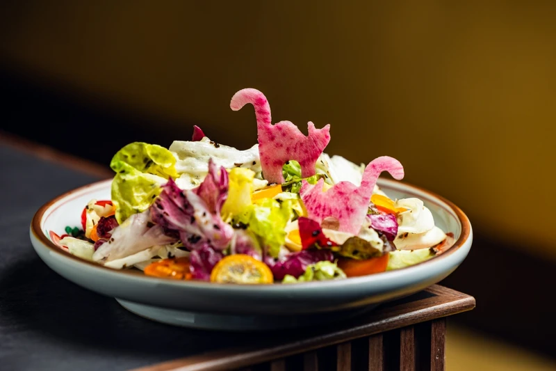 傳統居酒屋總有一碟僅淋上麻油調味的生高麗菜沙拉,用以解膩、清口。這款針對女性族群設計的沙拉,使用多款季節生菜,口感豐富;呼應傳統僅以麻油、鹽昆布調味。常民酒場沙拉的不修邊幅,在此變得時尚可愛。