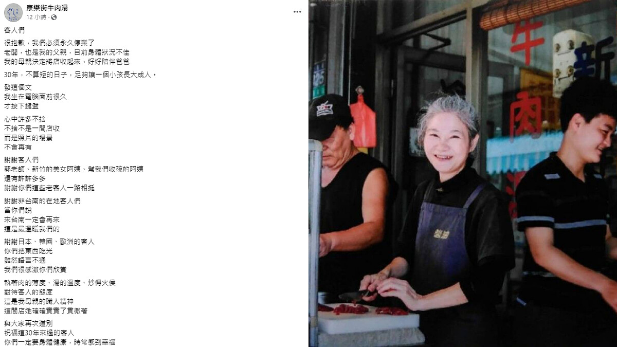 康樂街牛肉湯二代於11日深夜在臉書發文,表示由於父親身體狀況不佳,母親決定將經營30年的店面收起來,全心全意陪伴父親。一家人做了這個沉重的決定,同時也感謝顧客半甲子來的支持,希望大家未來都健康快樂。