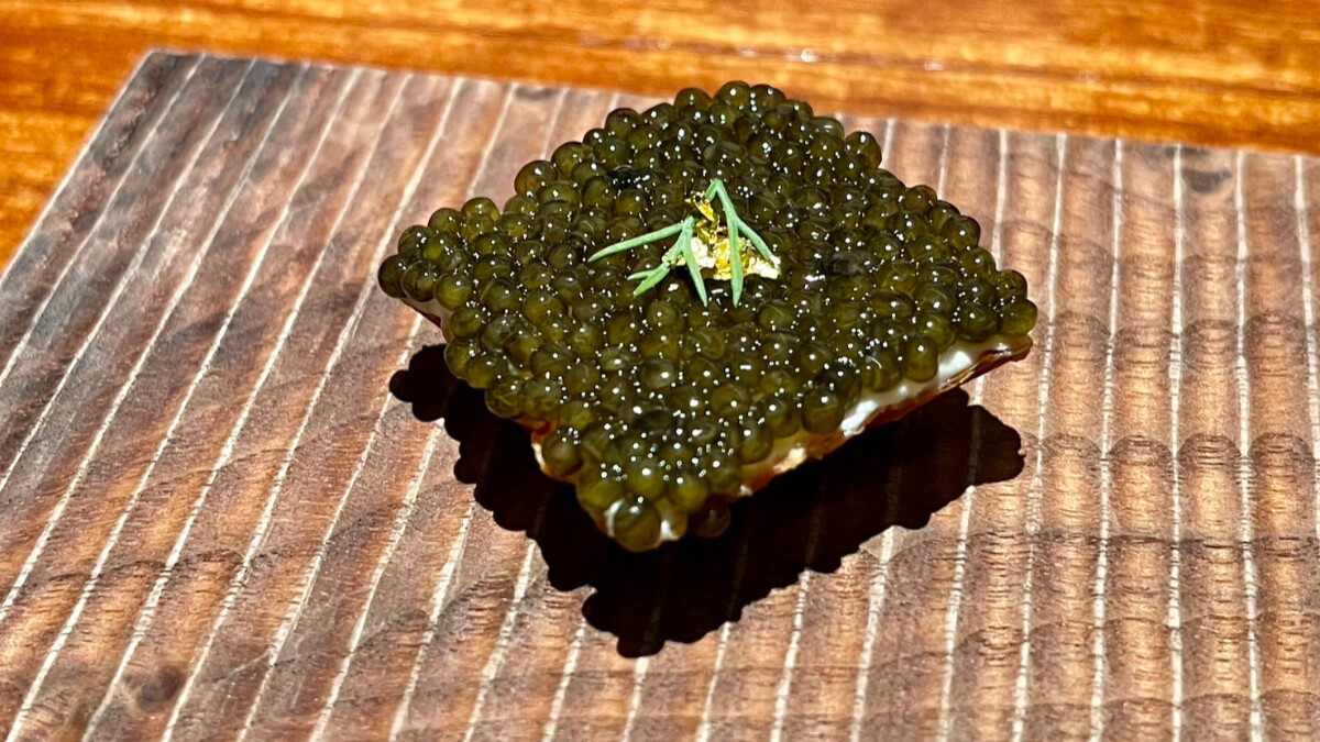 翻玩瑞典夏日不可或缺的龍蝦派對(Kräftskiva)料理手法啤酒烹煮(Beer Poaching),主廚選用帝王蟹浸泡啤酒製成內餡,並使用酸奶調味,填入以薄脆的 filo 製作的方形塔殼,灑上 Masala 與法國辣椒粉,口中洋溢著濃郁的異國香料同時,還能品嚐到上方滿鋪魚子醬的鹹鮮味與蟹肉絲口感。