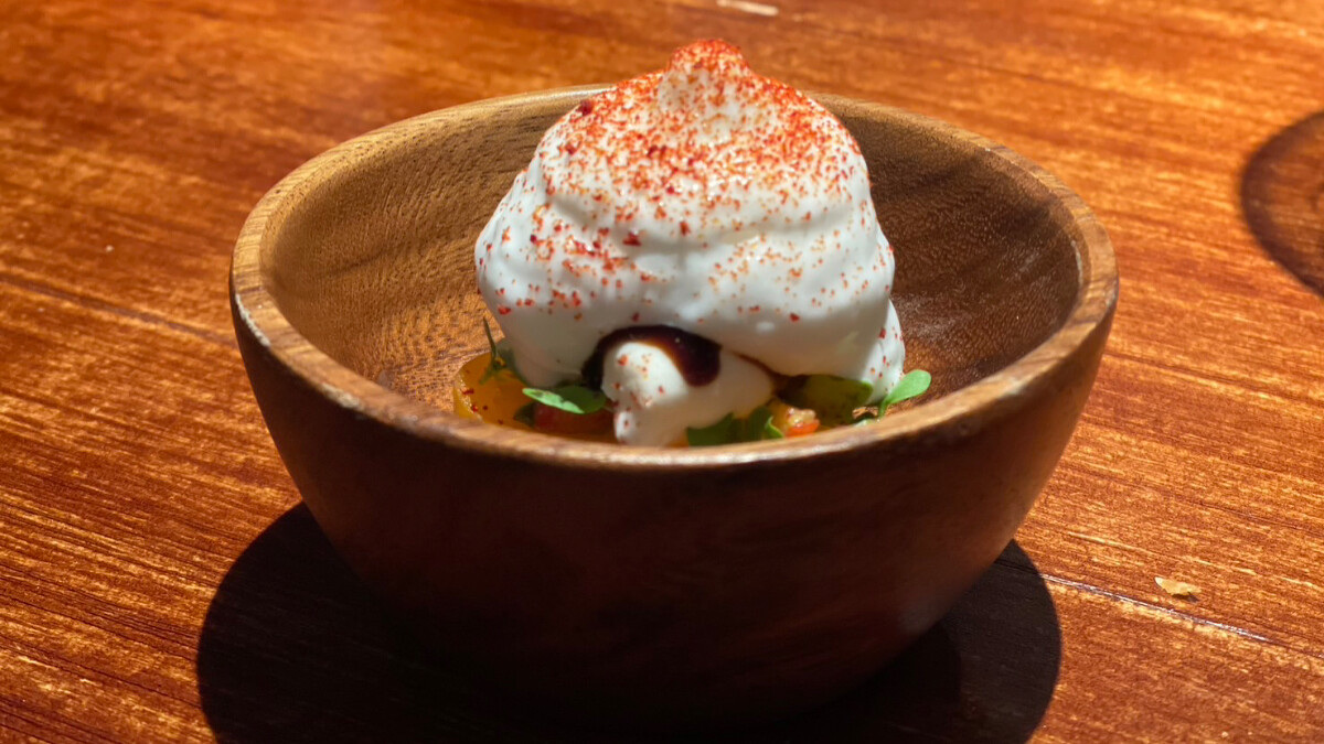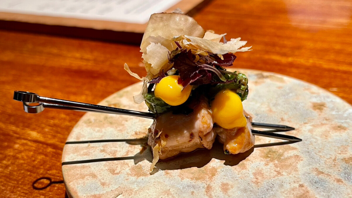 選用炭火燒烤來自紐西蘭的小羊胸腺,經過主廚細緻處理至風味圓潤、口感Q彈,再使用台灣醬油與椪醋調味,輔以炭烤的青龍椒與花椰菜搭配,就像是日是章魚燒。