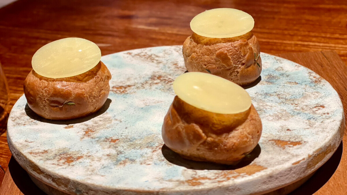經典的起司泡芙中,溫熱的內餡可嚐見以熟成 36 個月的康提起司與黑松露交織而成的濃郁,上方圓形的康提起司薄片,為泡芙帶來兩種不同狀態的起司風味。