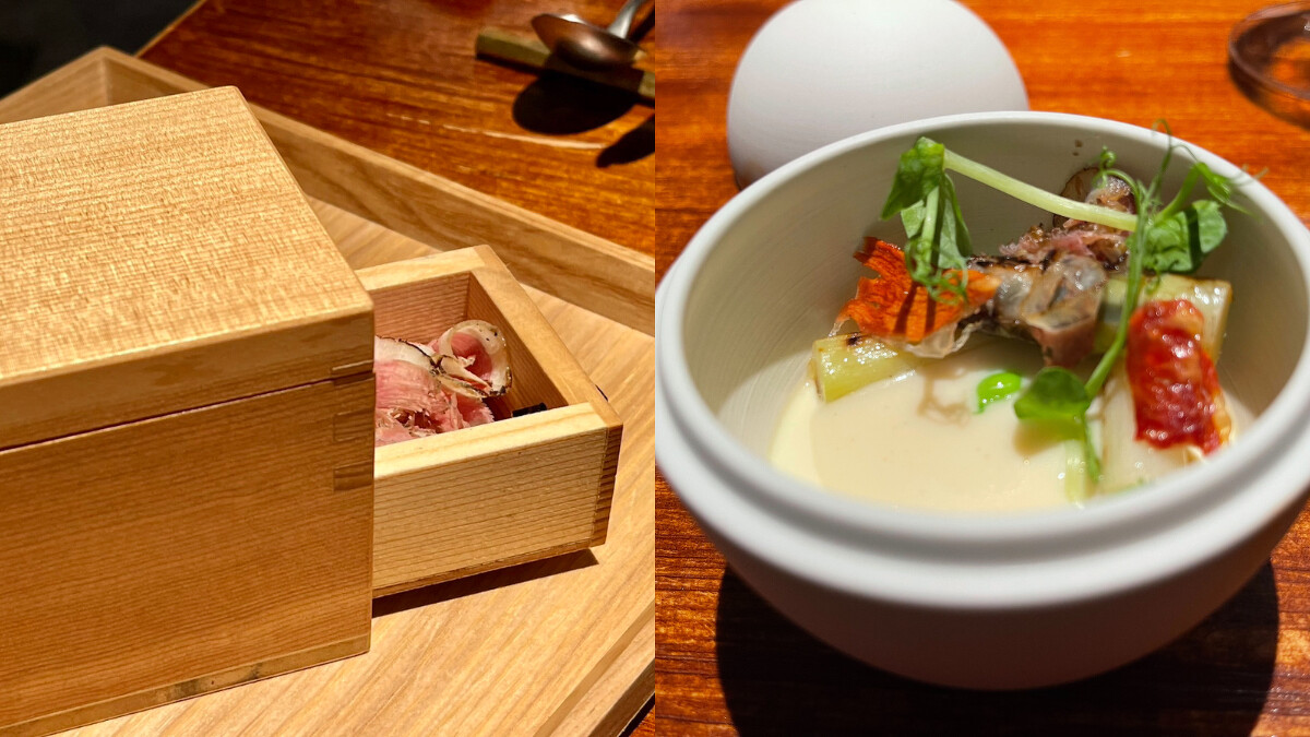 以被譽為湯中之王的「醃篤鮮」概念製成,底部的蘆筍蒸蛋沈浸於以老母雞、薑、金華火腿熬製的醬汁中,搭配來自嘉義的紫蘆筍、碗豆仁,以及西班牙火腿和主廚自製醃燻彰化櫻桃鴨胸。