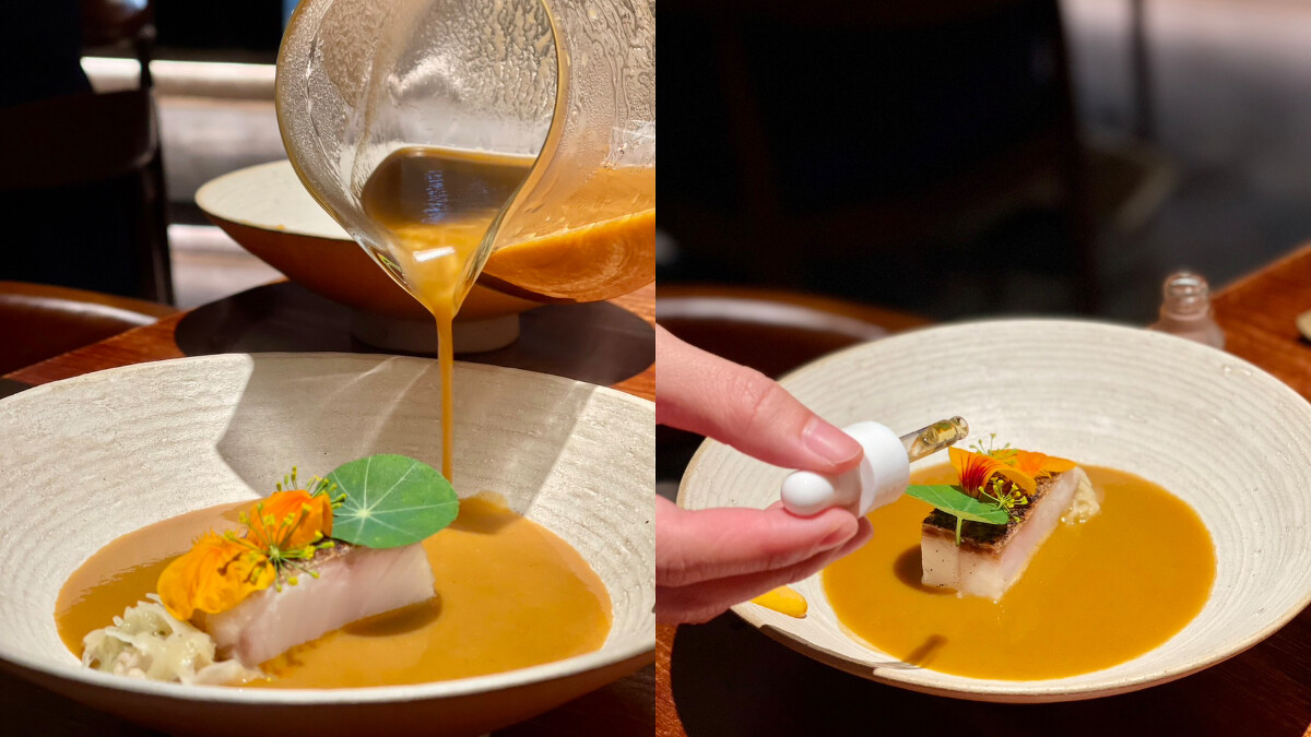 主廚選用當季肥美的白甘魚肉,夾層內藉由酸豆、松子、蕪菁、櫻桃蘿蔔增加口感豐富度,帶來清爽脆感,魚肉上方的半透明杜松子梅酒果凍、香菜花,揉合出明顯的酸味曲線層次,淋上橘黃色的南瓜油醋醬汁與抹上打碎鯷魚的白甘魚肉一同享用。
