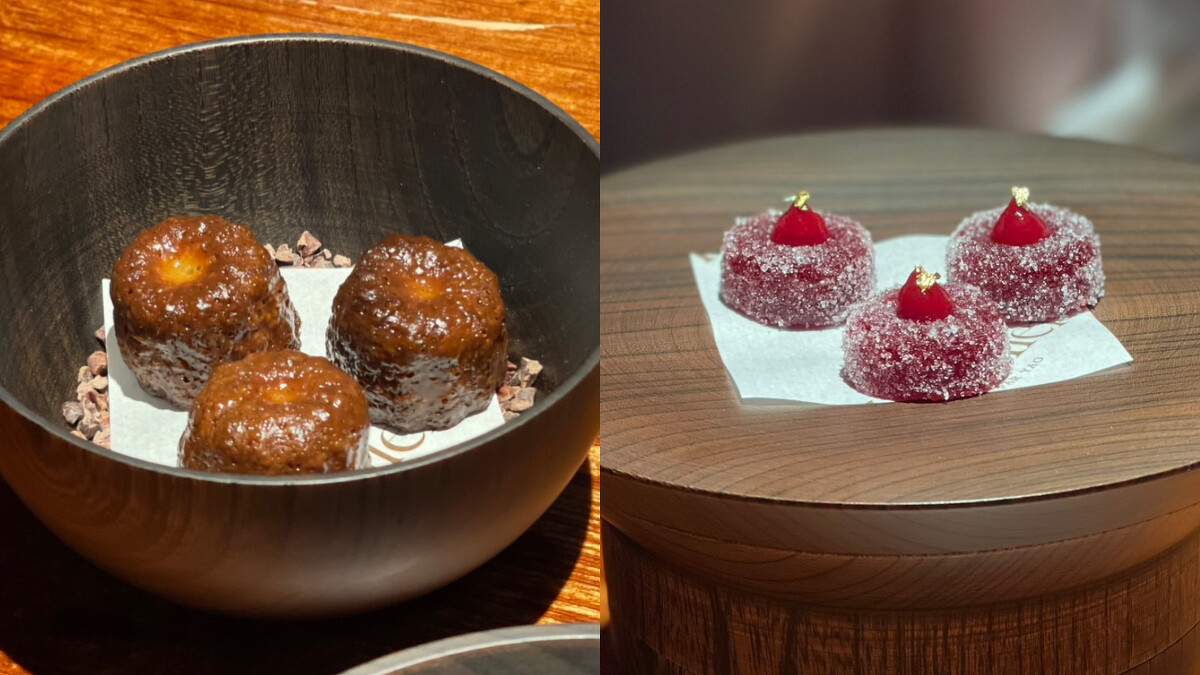 首先品嚐覆盆莓風味法式軟糖,柔軟的口感在舌尖上化開,帶來酸酸甜甜的滋味。接著是金鑽鳳梨及鹹蛋黃製成的鳳凰酥,輕輕一咬,外皮酥脆內裡鬆軟。