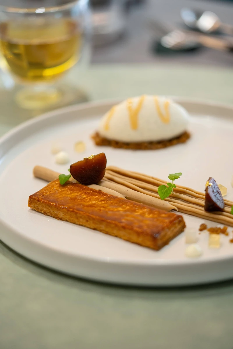 在《creammm.t》實體美村店,主廚Hannes將三款人氣甜點:家常檸檬塔、栗子千層派與風味生巧塔日曬,搭配人氣柯亞果醬變奏重組為三款法式盤餐,現場除了可享用到creammm.t最自豪的司康午茶組,還可搭配löwfun裸放茶旅的精選茶品、三款美村店限定的茶風味冰淇淋,此外,每日現場限量供應7入家常檸檬塔、4入司康、蝴蝶酥、栗子千層派、生巧克力塔等甜點禮盒。