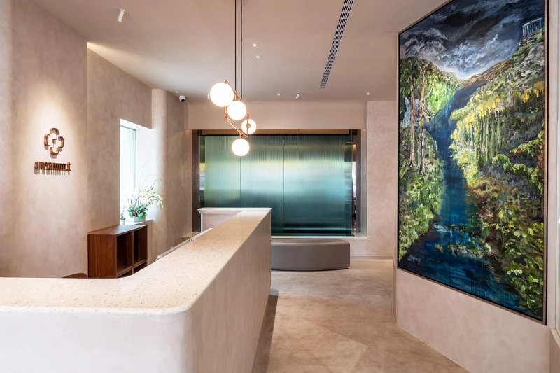 承襲品牌「藝術、原創、分享」的品牌哲學,《creammm.t》首家實體店以大面積的品牌經典柔和綠作為識別,店內藉由長虹玻璃的獨有質感,搭配靜謐的不飽和色調,營造暖心、通透又保有隱密性的用餐環境,主廚Hannes還特別獻上自己私藏已久、旅居英國家人親手繪製的巨幅畫作,迎接來店的每一位顧客。