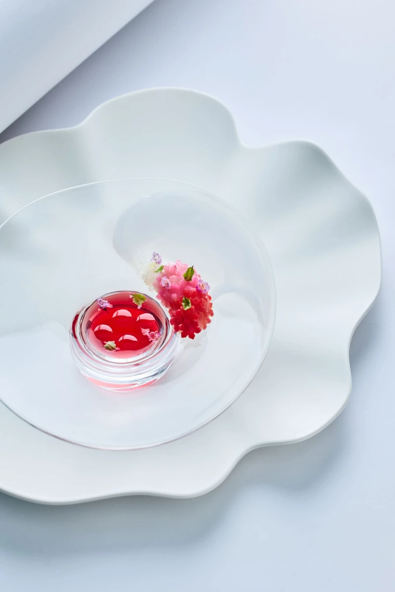 本季菜單以「紫蘇花」呈現大地回春、充滿生命活力的季節,揭開套餐序曲。主要食材選用刺身等級的野生牡丹蝦,先以蔓越莓果汁醃漬增添酸香,搭配酸奶油、紫蘇果凍和鱒魚卵豐富口感,右上角以各色櫻花狀的蘿蔔點綴鋪蓋在蝦肉之上,並以漸層的樣式排列,點綴上紫蘇花、咖啡油提香,食用時需要將蝦子與蘿蔔推入器皿中心的湖水醬汁之中。整體菜色精緻細膩,加上使用晶瑩剔透的訂製玻璃餐盤裝載,是本季最吸睛的菜色。