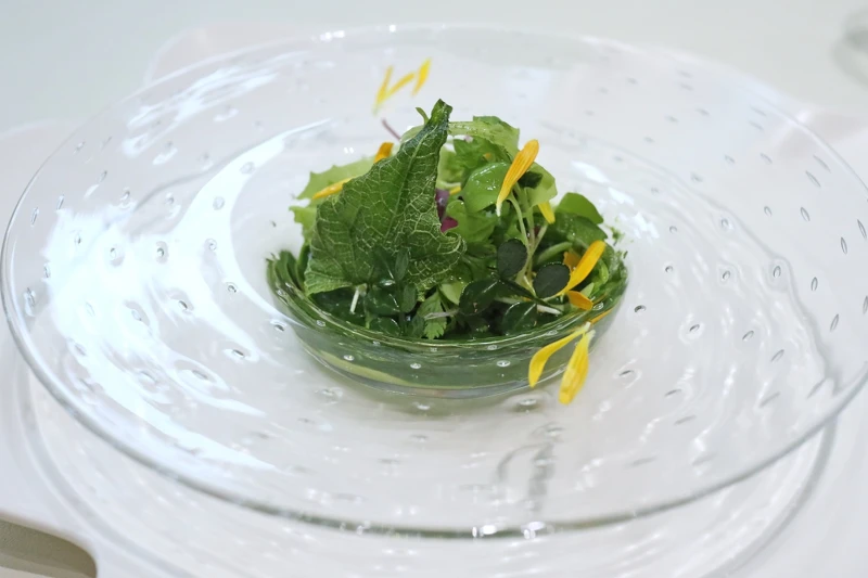 每一季主廚都會放進以蔬菜為主的沙拉料理,第一季有白色沙拉,第二季則是黑色,此次就以綠色調為主。以多種大家熟悉的山菜、野菜組成,包括過貓、皇宮菜、綠羽衣和川七花等,底層則是帶有乳脂味的酪梨醬,搭配上花蛤的風味,點綴上帶有苦味的茼蒿花(可食菊花)。而其中還有風味強烈的「胡椒木」,外型相似日本產的「木之芽」,風味則更為強烈帶有花椒的香氣,而這明亮的香氣讓這道溫沙拉更為精彩且獨特。