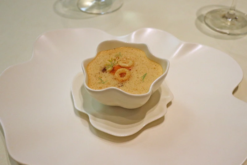 在「Restaurant A」使用的餐盤都是獨家打造的限定款,春季菜單中的「桂花海膽芙蓉盅」特選其中的雲朵小碗和底盤,做出彷彿出水芙蓉的絕美料理。此道湯品帶有中西融合的風味,以中式宮廷菜「賽螃蟹」為靈感,主廚在底部使用豆漿、蛋白蒸製了蒸蛋,並加入帶有口感的百合根,淋上西式料理手法熬製的海鮮高湯泡泡,並加入海膽增添鮮味,最後淋上透明盅中裡用火腿提煉的油、桂花醬,完成這道重量級工序複雜的湯品。