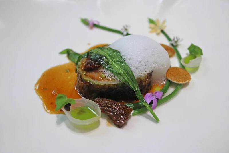 緊接著,以皺葉高麗菜包裹小牛里肌,肉質軟嫩程度幾乎不需過度咀嚼,羊肚菌的風味則成為亮點香氣,一旁則有嫩綠的小洋蔥搭配,主廚用韭菜花裝飾,讓菜品看起來就像一幅畫,加上輕盈的料理,刻畫出清新的春天。
