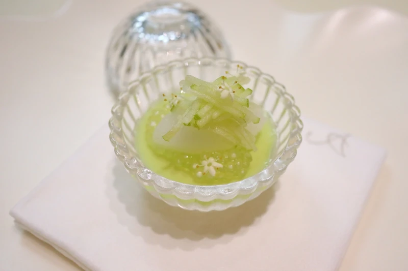 這道清口的甜品,以接骨木花為主角,最下層以威士忌奶酪鋪底,陸續放上小黃瓜、青蘋果果凍和冰沙,再以檸檬汁煮過的清透西谷米增加口感,最上面放入清蘋果細絲,以完全清新的果香成為風味轉場的最佳甜品。