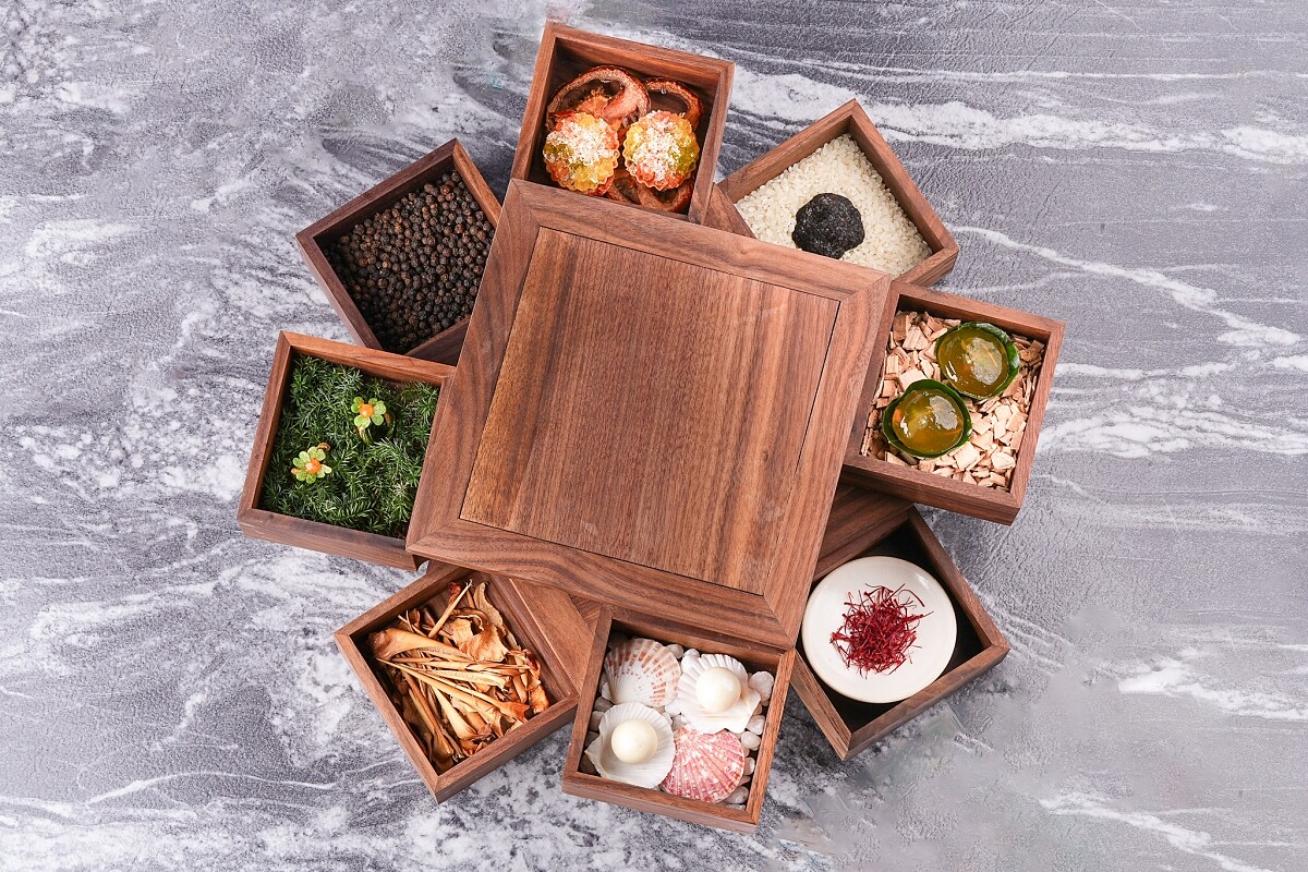 四道小點模擬了寶石、飾品的樣貌,並以特製的器皿裝載。