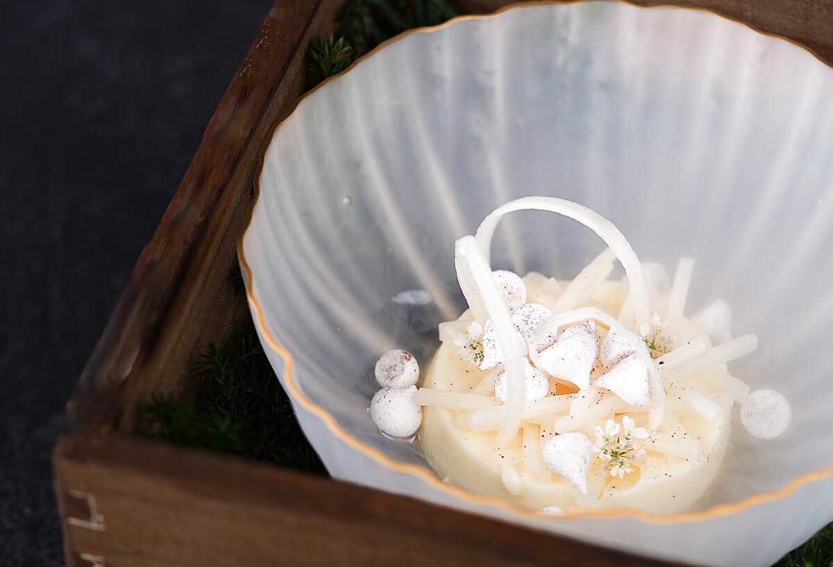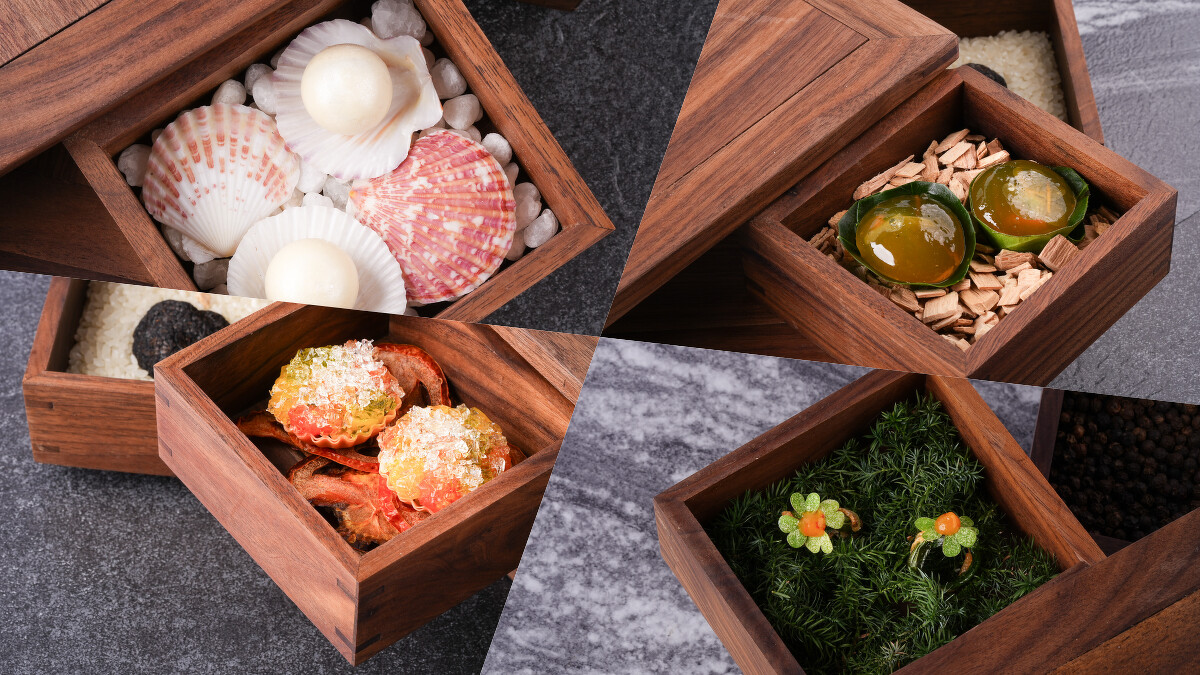 接續爆米花香氣,以玉米為主軸創作出繁花綻放的春菊,可先輕啜一口冷玉米鬚茶,為味蕾帶來清新的開端,並特選台灣白龍王玉米,顆顆晶瑩剔透、細緻鮮甜且飽滿多汁,如水果般清甜,底層是手工春捲皮烤製而成脆口酥皮,與伊比利火腿、玉米揉合豬板油製成的特製醬泥,相互堆疊而成,搭配法國魚子醬,入口滋味清甜鮮美。