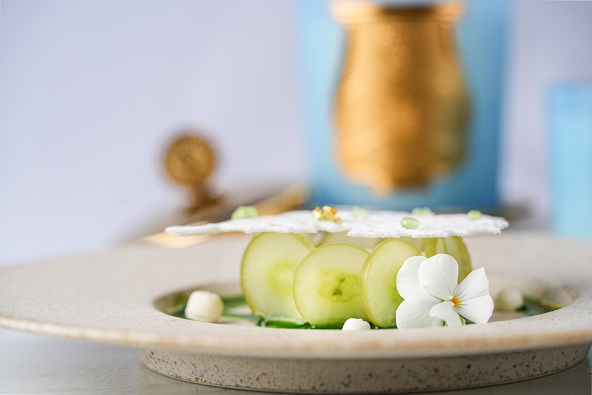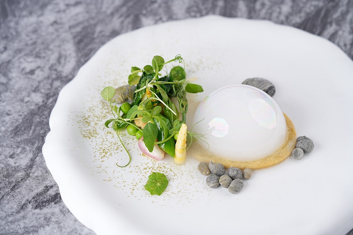 主廚以漫步於凡爾賽的湖畔的景象打造這道冷沙拉,將嚴選南非鮑魚切丁後拌上甘甜的鮑魚肝醬,佐以澄清芭樂汁象徵湖水鏡面,而 Chef Josh 將驚喜巧思加入於芭樂泡泡中,不僅為菜品增添了一份趣味,更寓含著對自然美景的珍惜和對地球環境保護的呼籲。當泡泡破掉瞬間,如同清晨時分凡爾賽池畔輕薄的朦朧霧氣,同時也象徵地球臭氧層,期盼共同保護地球,才能使美麗的綠意生命得以持續延續。