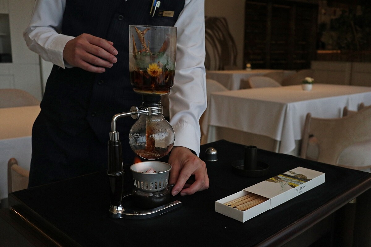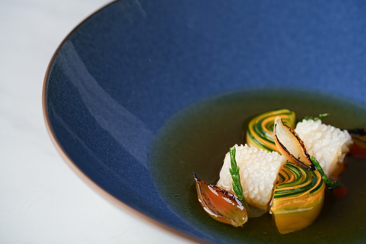 湯品以桌邊服務和虹吸式萃取的演示過程,為用餐經驗增添了一份互動性和儀式感,也試圖與阿波羅噴泉的畫面連結。湯品基底為經典的法式雞肉澄清湯,加入竹筍殼、肉桂、百里香等數種香料,增添木質香氣;選用日本干貝搭配香麻的有馬山椒,而外層以雕花的新鮮船釣小卷包覆,配上油封櫛瓜、番茄泥及海蘆筍增加鮮味,食材的相互襯映,不僅豐富了湯品的層次,也完美展現了海味的鮮美。