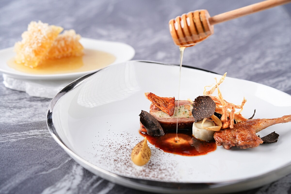 熱前菜選用嘉義鮮嫩鵪鶉,取其鵪鶉的胸,中間鑲嵌特製雞肉餡,整體外層包覆豬網油,刷上蜂蜜雞汁醬反覆香烤入味,搭配雞油菌、紅鳳菜等時令食材,佐以咖啡黑松露醬,此道料理的點睛之筆為蜂蜜,饕客可依自行喜好淋上適量蜂蜜,增添甜度與風味,肉嫩彈牙伴著香甜醬汁,口感豐潤且香氣迷人。