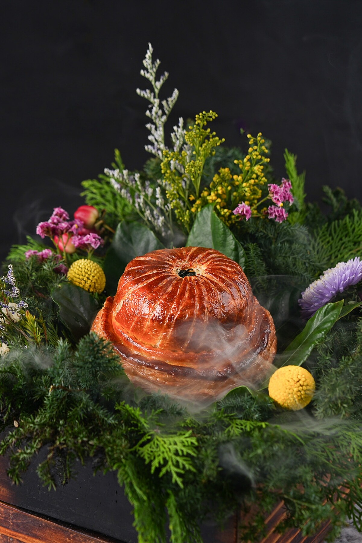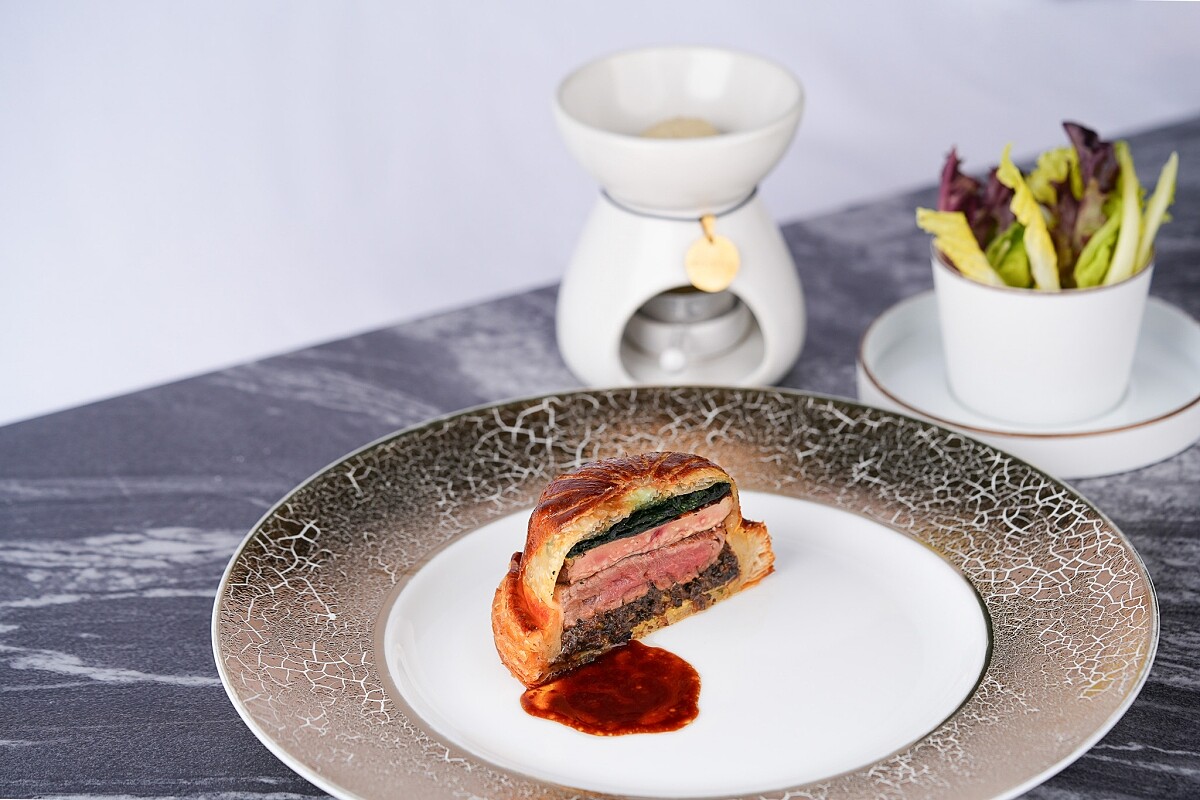 特製主菜皮蒂維耶酥皮餅(Pithivier),為鼎鼎大名威靈頓牛排的前身,製作工序相當複雜,展現主廚料理的細節,從食材的包覆堆疊到精準的火候控制,每一步都需要精確無誤,才能完美呈現。金黃酥脆的千層酥皮以可麗餅皮、紅酒燉牛尾燉肉餡、菲力牛、鴨肝及菠菜依序疊入派皮中,特別選用南美牛菲力,完美的三分熟度,粉嫩鮮甜透著肉質香氣,淋上濃郁的煙燻骨髓醬汁,每一口都是奢華的滋味,令人唇齒留香。