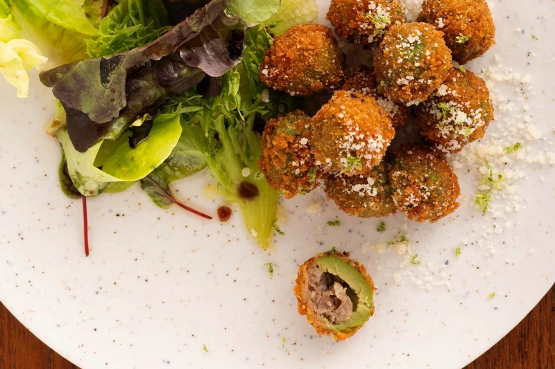 來自義大利中部 Marche 地區的炸橄欖,如今已成了義大利酒吧中最受歡迎的佐酒小菜之一。主廚特別選用了西西里綠橄欖,雖然個頭不大,卻甜而不澀。將其手工去核後,塞入紐西蘭羊絞肉,再裹上酥脆的粉狀麵糊,經過油炸而成。橄欖的清爽和羊肉的鹹香相得益彰,令人垂涎欲滴。