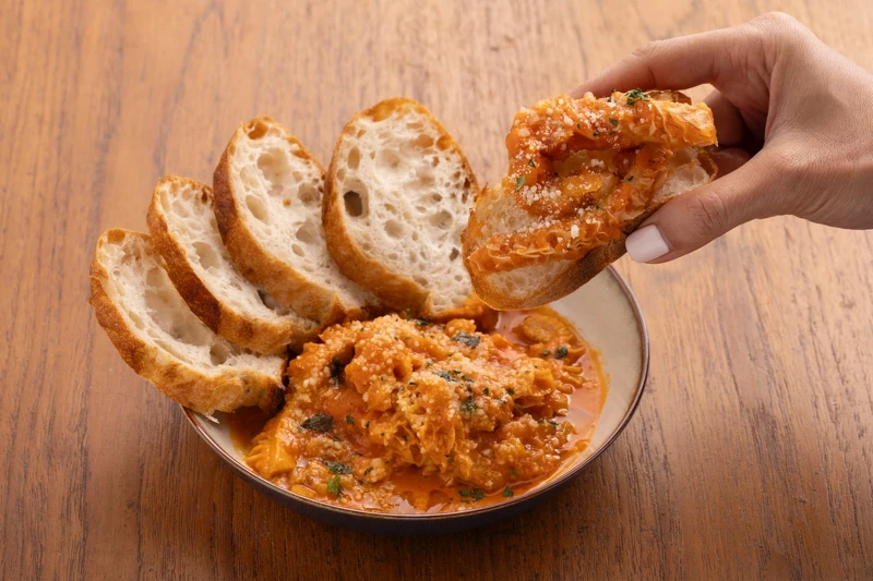 羅馬式燉牛肚是十八世紀的義大利傳統料理,主廚運用白酒醋、香草和番茄調味,燉煮2~3日,牛肚軟嫩微帶嚼勁。奶油、帕馬森起司和香草賦予柔滑質地和香氣,而薄荷葉和白酒漬葡萄乾的果香則為菜餚增添風味,濃郁中透著蔬果的清爽。