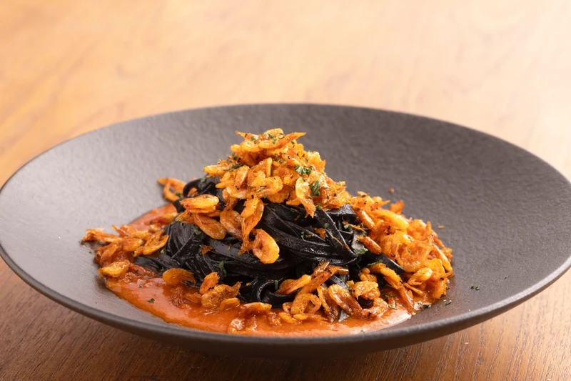 用新鮮墨魚汁和多種蔬菜、白酒調製出新鮮墨魚醬汁,搭配彈牙的杜蘭小麥粉製成的墨魚麵。海鮮高湯則以蛤蠣、蝦頭、魚骨和蔬果熬製而成,讓小番茄醬汁更添醇厚甜美。東港櫻花蝦以初炸橄欖油和辣椒煸炒,帶來大海鮮的風味,為味蕾帶來辛辣刺激的享受,共同營造出壯麗海洋美味的交響樂章。