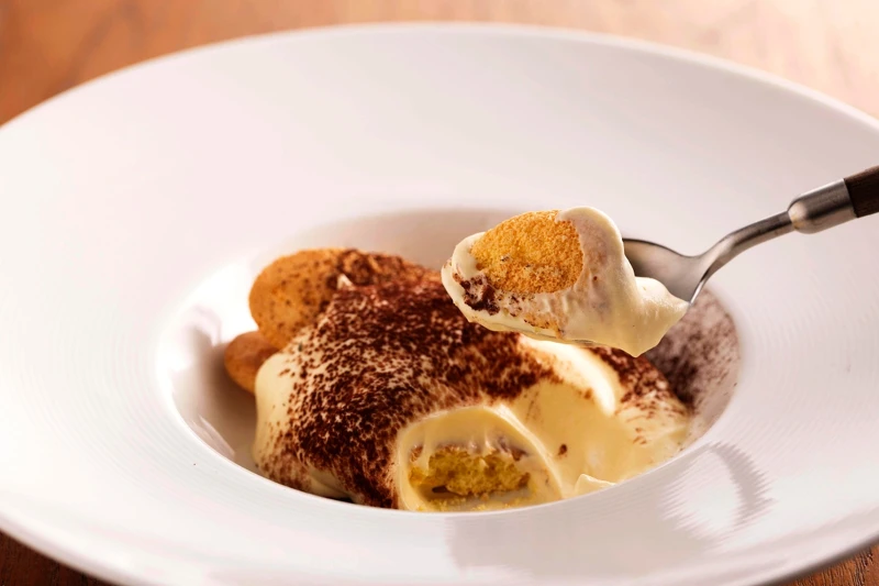 義大利料理的完美結尾,少不了經典甜點提拉米蘇的精彩登場。在Reale,我們以桌邊服務的方式為賓客增添儀式感。我們的提拉米蘇採用自製手指餅乾,浸泡在濃縮咖啡、咖啡酒、杏仁酒和香橙干邑甜酒中,再加入馬茲卡彭起司,最後撒上可可粉。手指餅乾吸取了咖啡液,帶來苦甜甘香的濕潤口感,與滑順清爽的馬茲卡彭起司完美融合,濃醇甜蜜的滋味定能擄獲每位食客的心。
