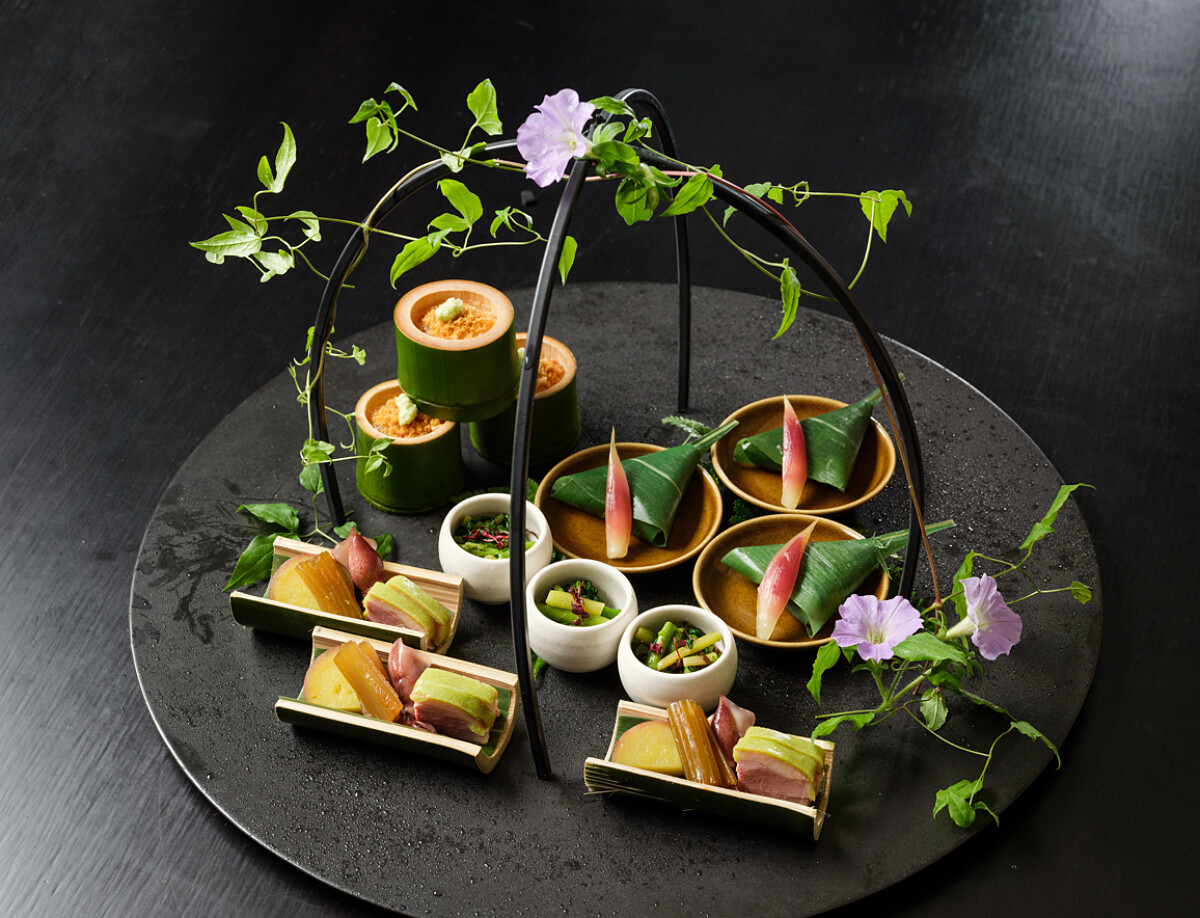 內有腰果與葛粉搭配上柴魚高湯製作成的「唐墨勾玉豆腐」,扎實的口感伴隨著灑上烏魚子粉末與腰果碎的香氣。「蘆筍鹽昆布』是以茼蒿、蘆筍以鹽昆布簡單調味,展現季節時蔬的美味。「丸十檸檬煮」使用糖與檸檬熬煮日本金時地瓜,綿密香甜又帶有果香。其餘還有「竹莢魚壽司」「西洋芹田舍煮」「新綠合鴨」「煙燻螢烏賊」「茗荷甘醋漬」,全都為季節旬味,以最精緻美味的姿態作為開場。