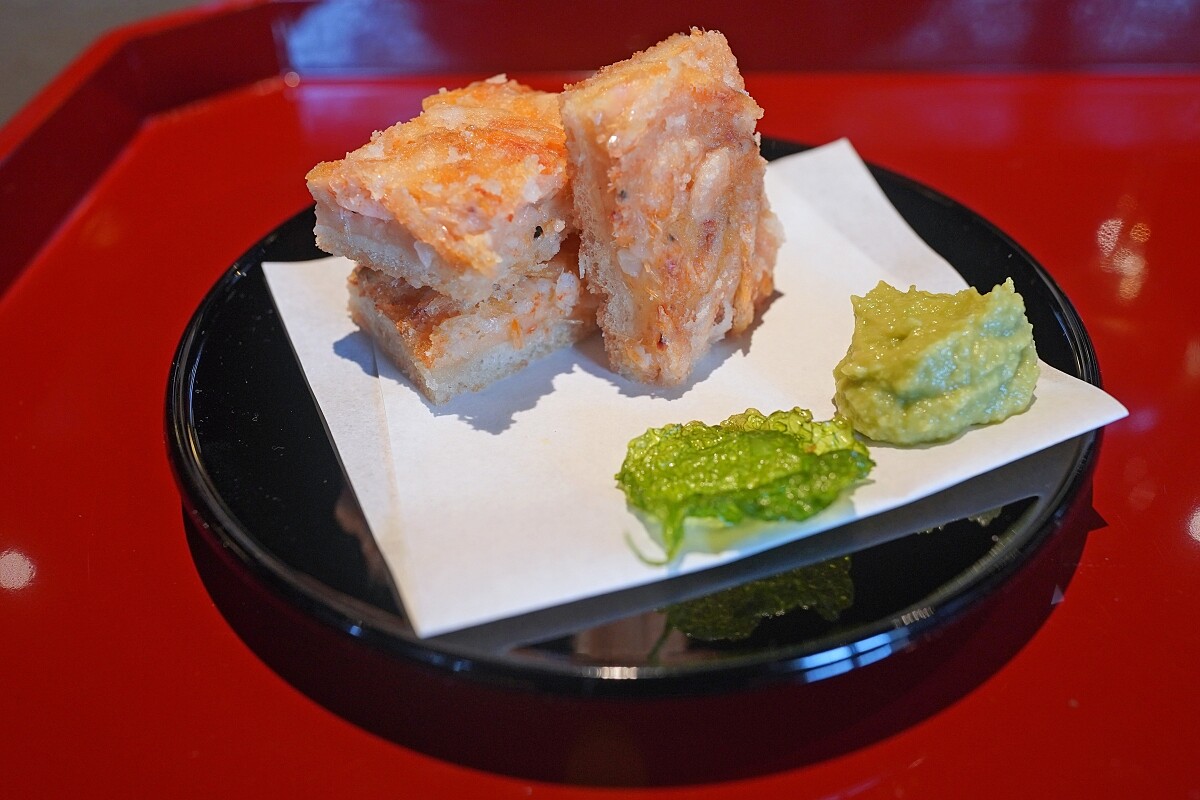 將生吐司塗上蝦餃肉、蛋黃醬、牛奶洋蔥、櫻花蝦粉製作而成的蝦醬,先酥炸後再切塊,灑上櫻花葉碎,一旁搭配炸莧菜,可沾著酪梨、山葵、白醬油、檸檬汁調製的酪梨醬一起享用。擺盤上用了日本端午節(5月5日)才有的箭矢造型的裝飾,有去病消災的含義。