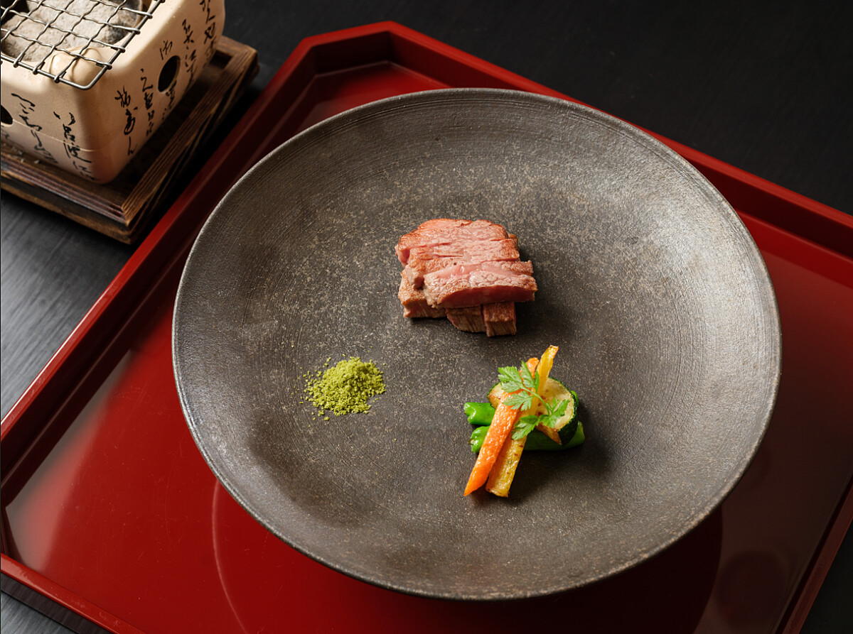使用A5日本黑毛和牛菲力部位用牛油將兩面煎上色,再透過位上的文字爐以炭火燒烤,賓客能自由選擇熟度後享用,一旁則有紅蘿蔔、櫛瓜苦搭配享用。