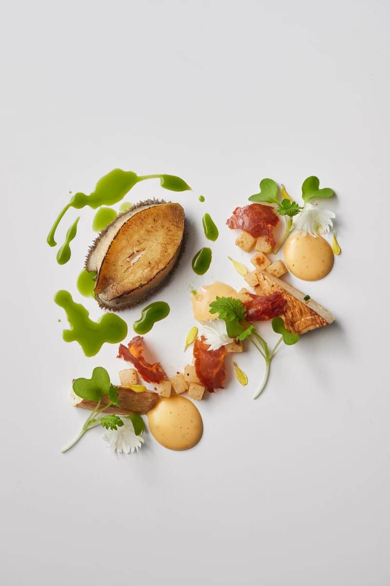 靈感來自「法式吐司」,主廚將吐司浸泡在蛋液中,煎兩面至金黃酥脆、內層柔軟。主廚以赤海膽點綴,淋上新鮮的檸檬汁和香料,讓濃郁海味加入清新果香,最後與拜雍火腿一起入口,融合成鹹香旨味。