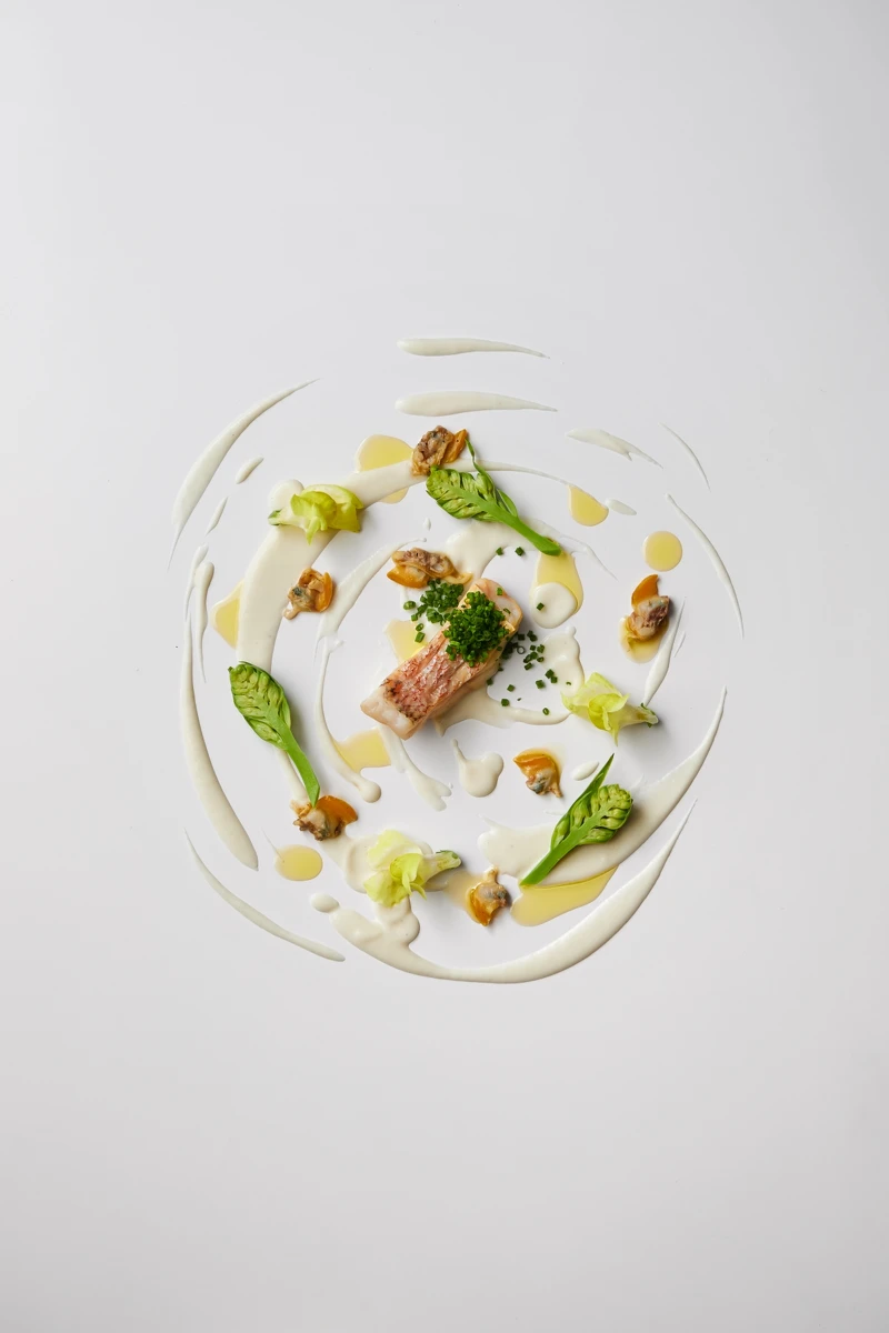 台灣野生海儷魚的肉質細軟、味道鮮美,主廚以條狀切片取代麵條,搭配柚子凝膠,口感清爽微酸,點綴上清爽的海葡萄,口感與風味都有著一股和諧輕盈。