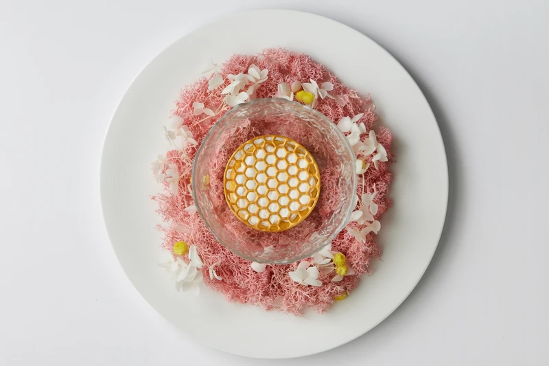 「百花蜜」是由蜜蜂採集不同植物的花蜜制成,因此每批百花蜜的味道也稍有不同。使得每一次品嚐都有一種獨特的驚喜感,尾韻帶有清爽的香氣品嚐起來不甜膩。主廚即以百花蜜的精心烘焙成蛋糕體,搭配上山楂冰和檸檬醬,從香甜的蜂蜜蛋糕到冰涼的山楂冰,再到清新的檸檬醬,每一口都是一場不同風味的探索。