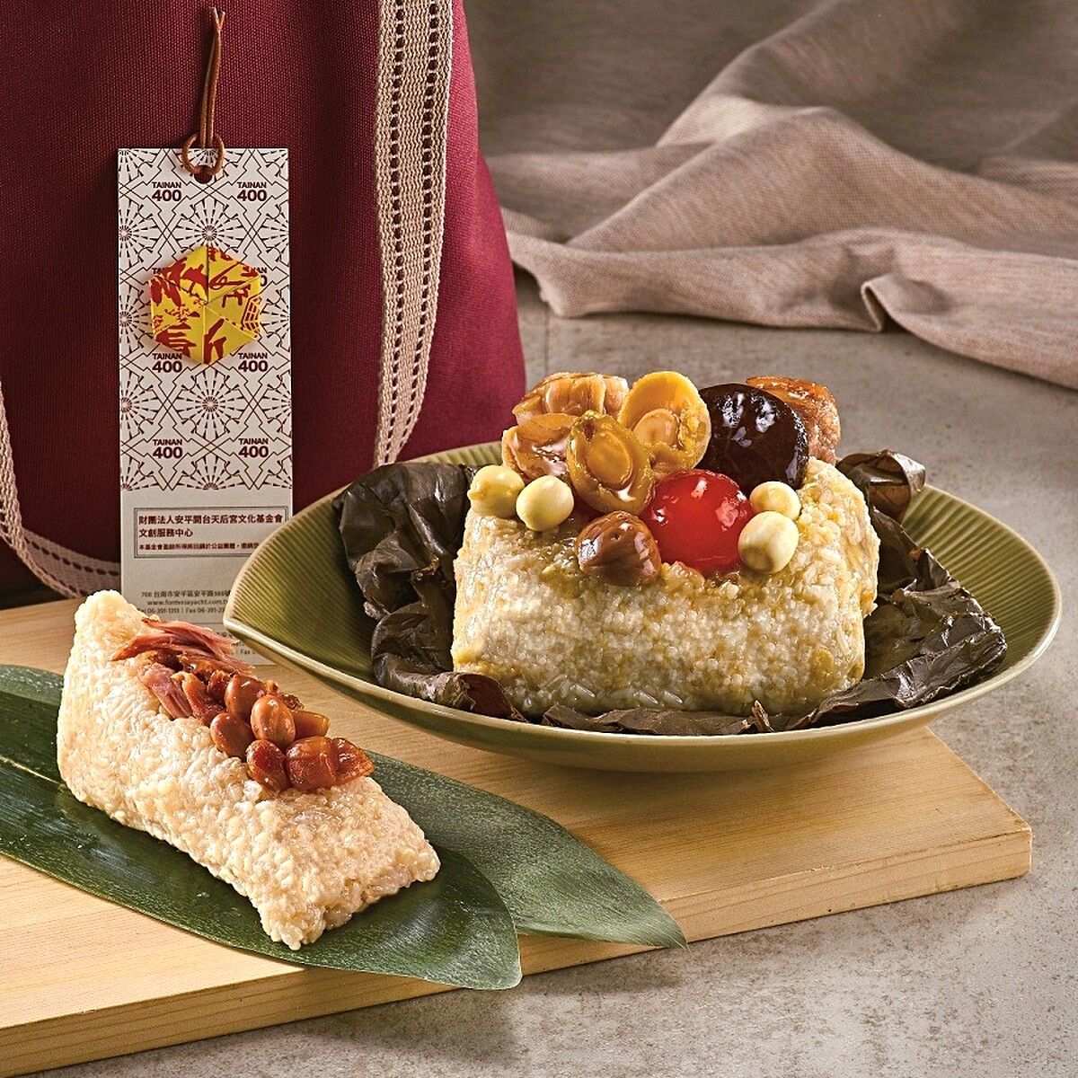 今年承接520國宴的福爾摩沙遊艇酒店,也與新光三越、安平開臺天后宮進行首度獨家聯名,裡頭有加入鮑魚及瑤柱的肇慶裹蒸粽、傳統潮州粽、合成帆布行包袋,還有一個以Q版開臺媽祖融入臺南400視覺設計的「護身符書籤」,同樣極具收藏價值。「開台400年端午粽禮袋」售價1298元
